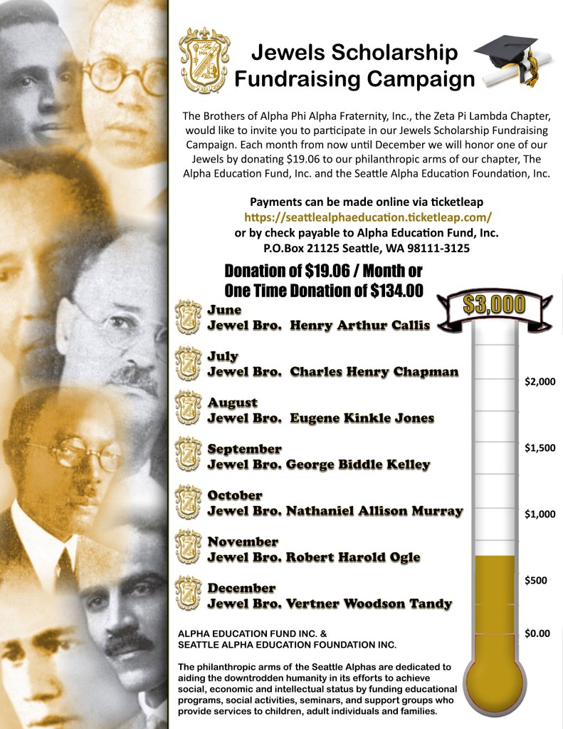 The Brothers of Alpha Phi Alpha Fraternity, Inc., the Zeta Pi Lambda Chapter, would like to invite you to participate in our Jewels Scholarship Fundraising Campaign. Each month from now until December we will honor one of our Jewels by asking for a donation of $19.06 to our philanthropic arms of our chapter, The Alpha Education Fund, Inc. and the Seattle Alpha Education Foundation, Inc.